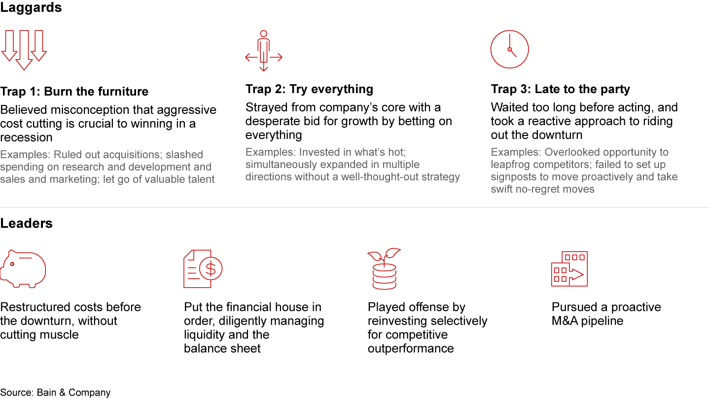 Who is best positioned to come out of the current climate unscathed or, better yet, on top? We only need to look at previous downturns and periods of uncertainty to see what doesn’t work (see Figure 1).