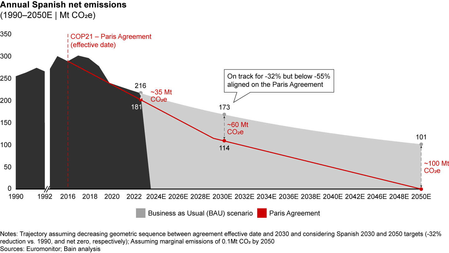 Although the Spanish public and private sectors have taken admirable steps to head off a climate emergency, helping to cut nationwide emissions by 4.1% a year since the implementation of the Paris Agreement in 2016, Bain analysis shows the country could still fall short of its climate ambitions.